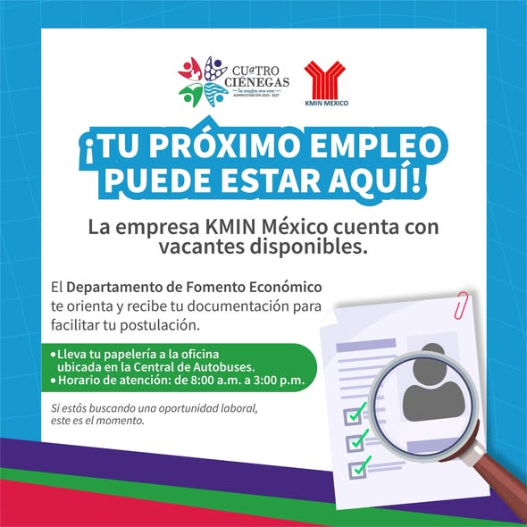 Con el firme compromiso de seguir generando más y mejores oportunidades laborales para la población, el alcalde Víctor Leija Vega informó que actualmente se encuentran disponibles vacantes en la empresa KAMIN México, ubicada en la ciudad de Ramos Arizpe.